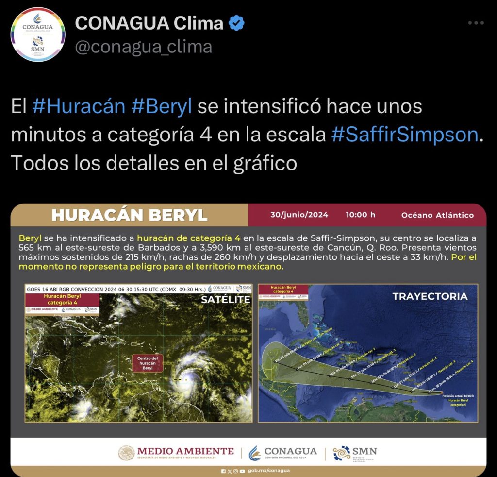 La Comisión Nacional del Agua (CONAGUA) informa que el Huracán “Beryl” se intensificó ya a categoría 4 en la escala SaffirSimpson