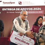 De manera simbólica, se entregaron 916 becas del ITABEC en Nuevo Laredo, como parte de un total de 10,244 becas otorgadas en toda la UAT, que representan una inversión de 25 millones 610 mil pesos, incrementando el apoyo a cada estudiante de 2,000 a 2,500 pesos.