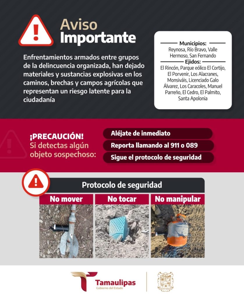 A través de sus redes sociales oficiales, se está pidiendo a los habitantes de Reynosa, Río Bravo, Valle Hermoso y San Fernando que en caso de detectar algún objeto sospecho, se alejen de inmediato, lo reporten al 911 o al 089 y que sigan el protocolo de seguridad de no mover, no tocar y no manipular.
