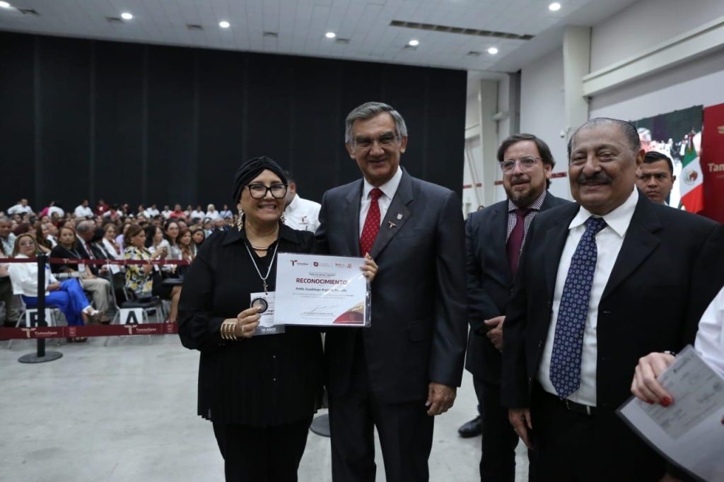 Por la mañana, en el Centro Regional de Formación Docente e Investigación Educativa (CRETAM), Villarreal Anaya presidió la ceremonia de ingreso a la Galería de Honor del Magisterio Tamaulipeco, y entregó reconocimiento y la medalla Lauro Aguirre a la galardonada de Educación Básica, doctora María de Jesús Lara Tijerina, y a la doctora Lucila Olvera Flores, galardonada de Educación Media Superior y Superior.