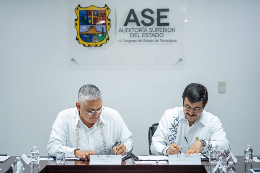 El rector de la Universidad Autónoma de Tamaulipas (UAT), Dámaso Anaya Alvarado, y el titular de la Auditoría Superior del Estado de Tamaulipas (ASE), Francisco Antonio Noriega Orozco, presidieron la firma del convenio marco de colaboración con el propósito de establecer una alianza estratégica que fortalezca la cooperación académica, técnica y profesional.