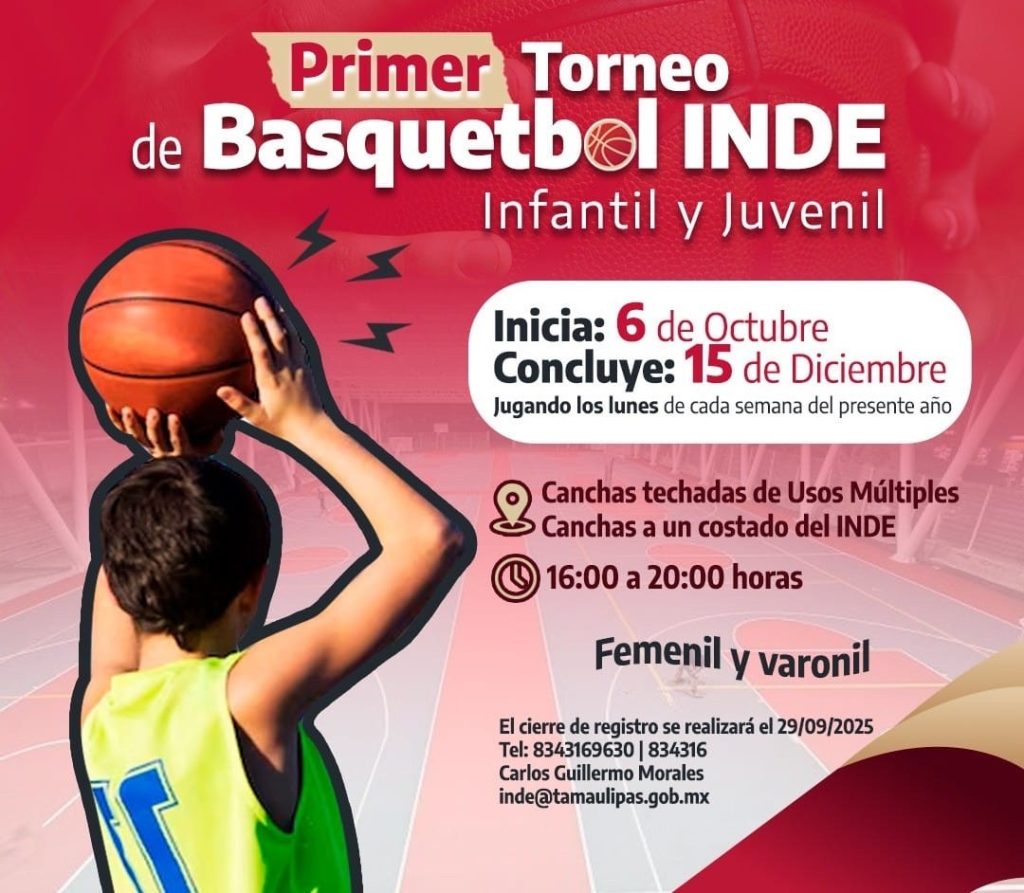 Ciudad Victoria, Tamaulipas.- El Instituto del Deporte de Tamaulipas (INDE) convoca a la comunidad deportiva al Primer Torneo de Básquetbol “Gobernador Américo Villarreal Anaya”, el cual se jugará en sus diferentes categorías, teniendo como sede Ciudad Victoria.