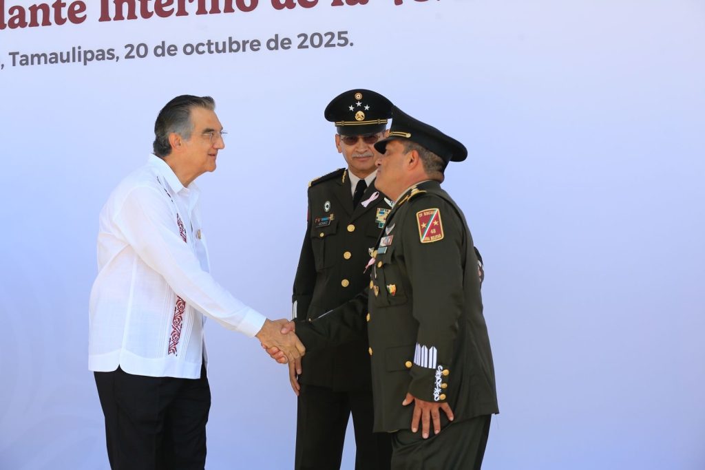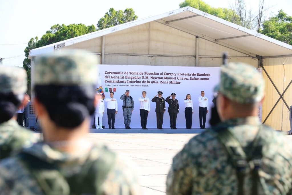 Ciudad Victoria, Tamaulipas.- El gobernador Américo Villarreal Anaya asistió como invitado de honor a la toma de posesión al cargo y protesta de bandera del general brigadier de Estado Mayor, Newton Manuel Chávez Baños, como comandante interino de la 48 Zona Militar.
