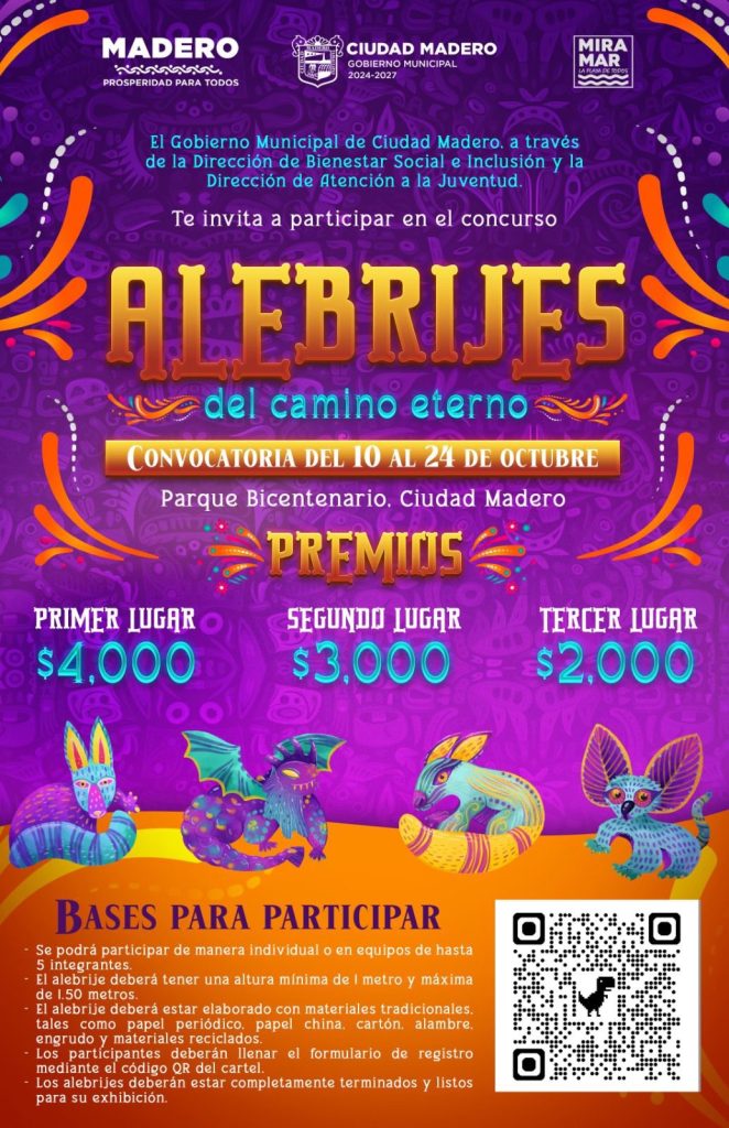 Otro concurso será el de Alebrijes del Camino Eterno, cerrando la convocatoria el próximo 24 de octubre y podrá ser de manera individual o equipos. La altura del alebrije mínimo será de 1.00 metros y máxima de 1.50 metros y deberá ser elaborado con materiales tradicionales, con papel periódico y china, cartón, alambre, engrudo y materiales reciclados.