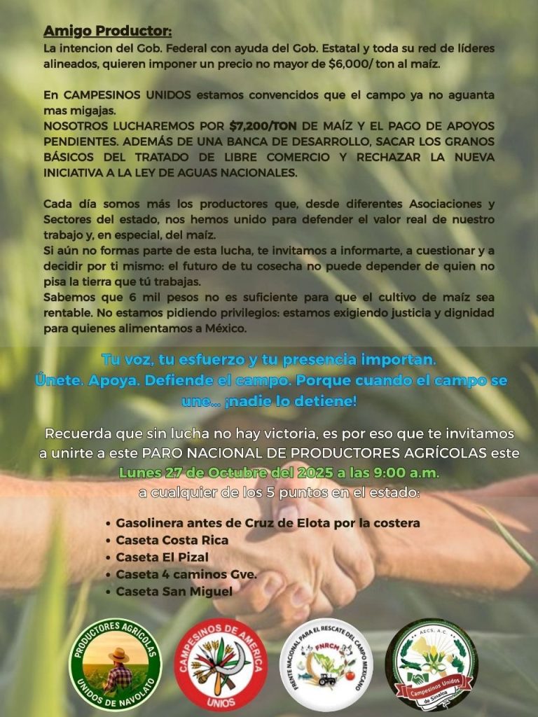 Hagamos extensiva esta invitación, recordemos que SIN MAIZ, NO HAY PAÍS. POR LA DIGNIDAD DEL CAMPESINO MEXICANO”, es parte de lo que se lee en la convocatoria.