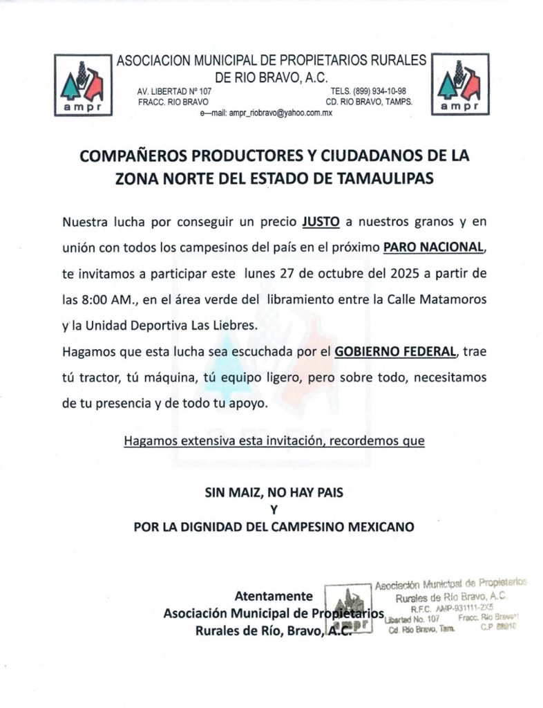 Pero si usted tiene que viajar por esta cua de comunicación terrestre, tome muy en cuenta que podría ser bloqueada ya que además, la Asociación Municipal de Propietarios Rurales de Río Bravo A.C. está también convocando a los hombres del campo tamaulipeco a unirse al Paro Nacional para conseguir un precio justo para los granos.