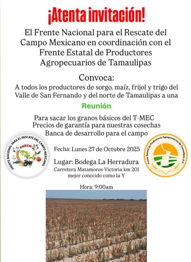 El Frente Nacional para el Rescate del Campo Mexicano en coordinación con el Frente Estatal de Productores Agropecuarios de Tamaulipas esta convocando a todos los productores de sorgo, maíz, frijol y trigo del Valle de San Fernando y del norte de Tamaulipas a una reunión donde como temas centrales destacan: sacar los granos básicos del T-MEC y exigir precios de garantía para sus cosechas.