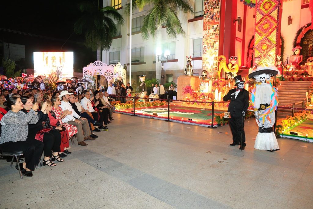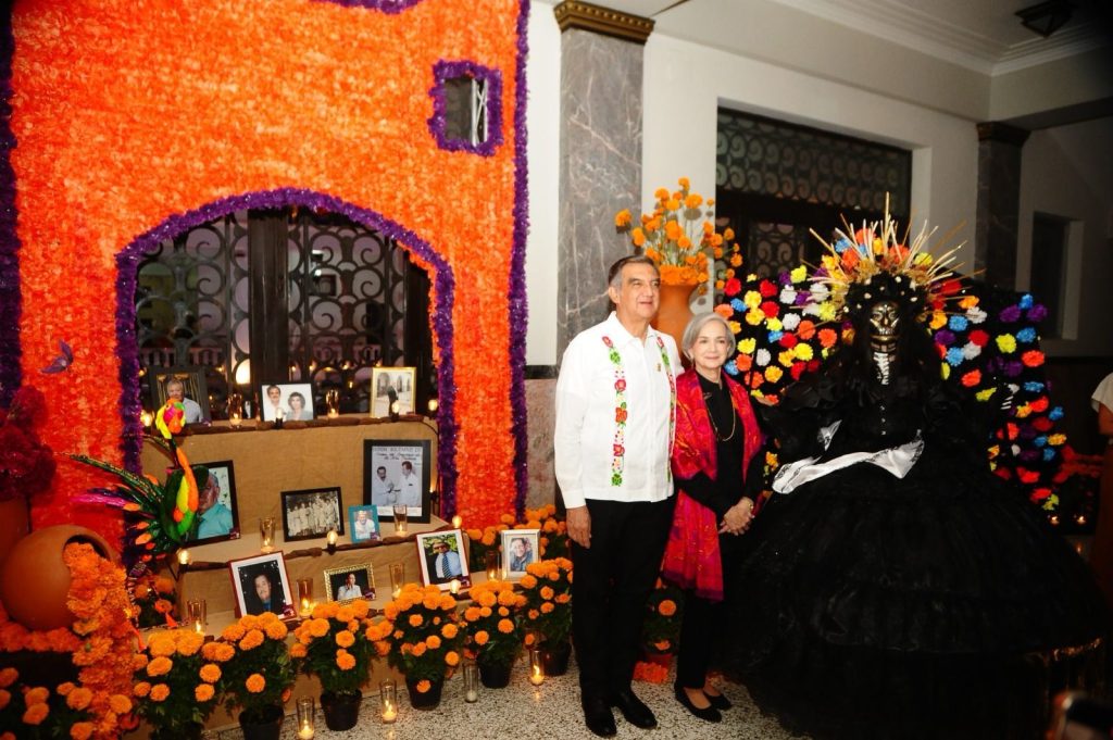 Ciudad Victoria, Tamaulipas.- En un ambiente impregnado por el aroma de la flor de cempasúchil, el pan de muerto y las luces de las velas, el gobernador Américo Villarreal Anaya y la presidenta del Sistema DIF Estatal, María de Villarreal presidieron la premiación del concurso estatal de catrinas y catrines «Almas Tamaulipecas» y la muestra del altar monumental del Día de Muertos en las escalinatas de Palacio de Gobierno .