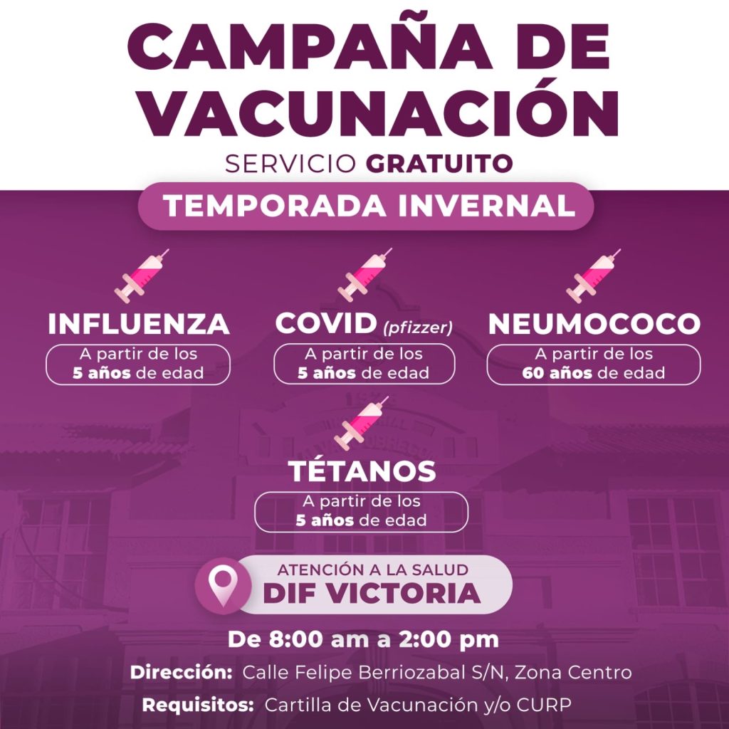 Con el propósito de cuidar la salud de las familias victorenses durante la temporada invernal, el Sistema DIF Victoria y su Presidenta Lucy de Gattás, invita a la población a participar en su Campaña de Vacunación Gratuita, disponible en el área de Atención a la Salud.