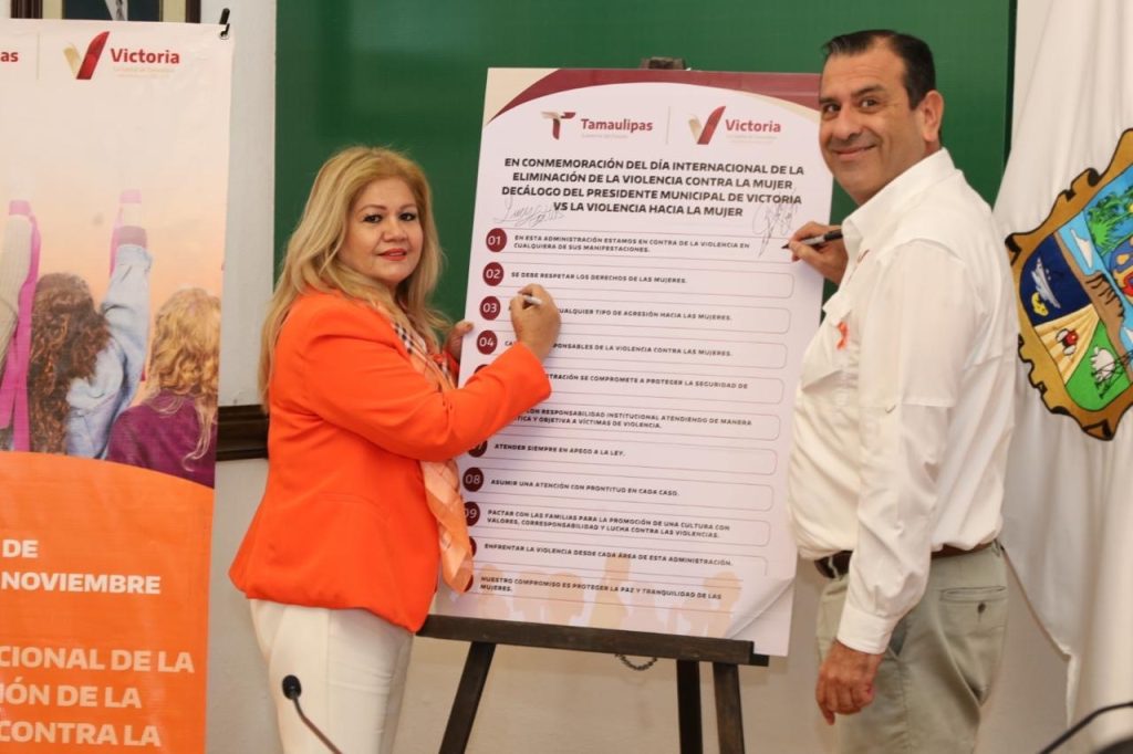Con la presencia de la presidenta del Sistema DIF, Lucy de Gattás, el alcalde de Victoria, Eduardo Gattás Báez firmó, junto a integrantes del Gabinete Municipal, el decálogo contra la violencia hacia la mujer para dar paso firme hacia un futuro libre de violencia de género.
