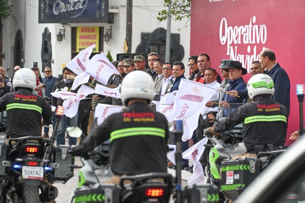 Con 350 elementos policíacos, de protección y auxilio, el alcalde de Victoria Eduardo Gattás Báez dio el banderazo al operativo navideño 2025, para reforzar la seguridad de residentes y visitantes a la Capital durante la época decembrina.
