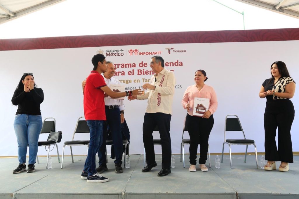 El director general del INFONAVIT, Octavio Romero Oropeza, en compañía del gobernador de Tamaulipas, Américo Villarreal Anaya, encabezó la entrega de 118 viviendas del Bienestar, en el fraccionamiento Todos por Tamaulipas, ubicado en el municipio de Ciudad Victoria.
