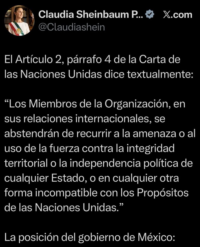 El Gobierno de México condena y rechaza enérgicamente las acciones militares ejecutadas unilateralmente en las últimas horas por fuerzas armadas de los Estados Unidos de América contra objetivos en territorio de la República Bolivariana de Venezuela, en clara violación del artículo 2 de la Carta de la Organización de las Naciones Unidas (ONU).