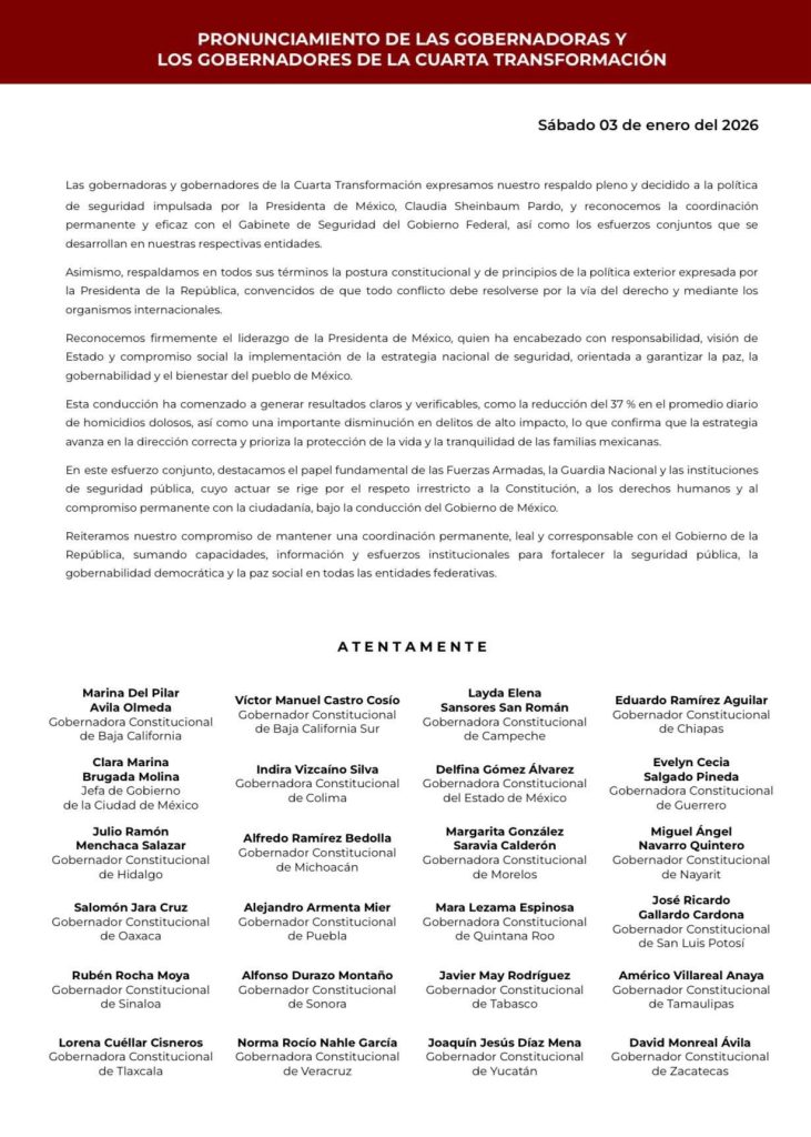 “Las gobernadoras y gobernadores de la Cuarta Transformación expresamos nuestro respaldo pleno y decidido a la política de seguridad impulsada por la Presidenta de México, Claudia Sheinbaum Pardo, y reconocemos la coordinación permanente y eficaz con el Cabinete de Seguridad del Gobierno Federal, así como los esfuerzos conjuntos que se desarrollan en nuestras respectivas entidades.
