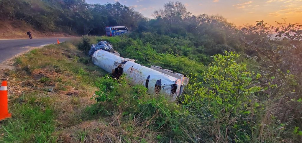 Al acudir al punto localizaron un tractocamión tipo pipa, volcado a un costado de la carretera, sin obstruir la circulación.